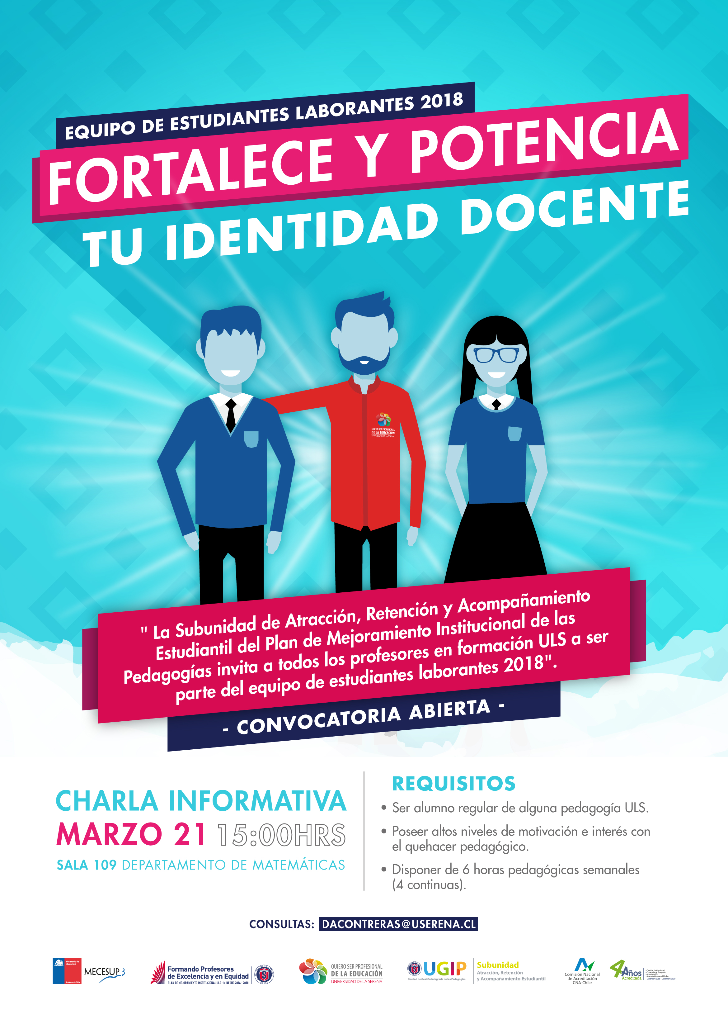 La UGIP a través de la subunidad de «Atracción, Retención y Acompañamiento estudiantil» invita a todos los profesores en formación a ser parte del equipo de estudiantes laborantes 2018 del programa «Quiero ser Profesional de la Educación», instancia que se concibe como una estrategia, certificada por el MINEDUC, de preparación y fortalecimiento de la identidad profesional docente para potenciar y desarrollar habilidades en los estudiantes de enseñanza media interesados en la profesión docente.