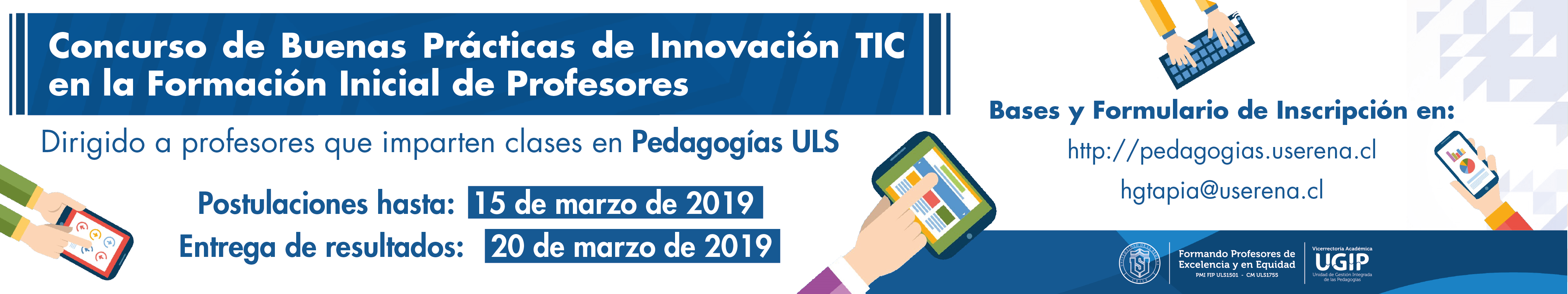 La Unidad de Gestión Integrada de las Pedagogías (UGIP) invita a participar en el concurso “Buenas Prácticas de Innovación TIC en la FIP”, el cual se enmarca dentro del Plan de Implementación para el fortalecimiento de la formación de profesores de la Universidad de La Serena, de acuerdo al diagnóstico estratégico y a las nuevas políticas para la educación chilena.