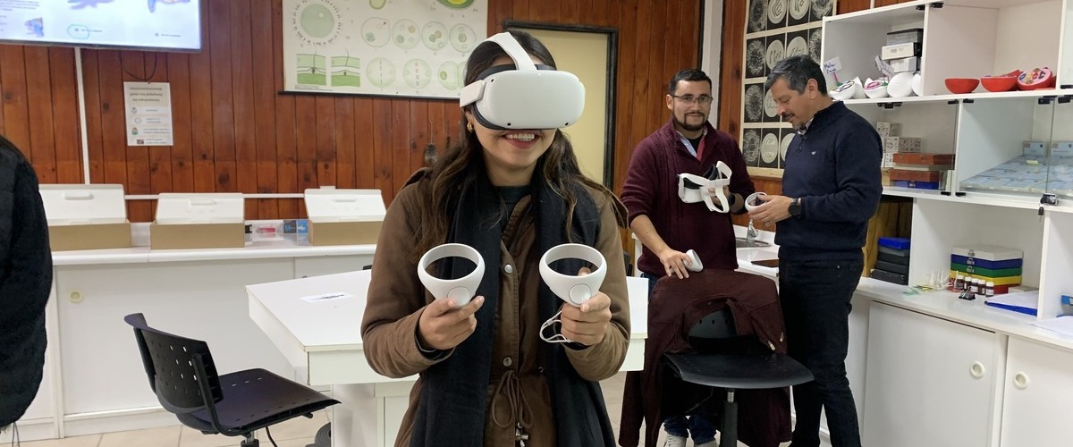 Con el objetivo de generar una profundización didáctica, estudiantes de la carrera de Pedagogía en Educación General Básica conocieron de cerca la integración de tecnologías digitales para apoyar aprendizajes de las ciencias naturales en las escuelas. Bárbara Pérez, alumna de dicha carrera, señaló al respecto que “el objetivo de venir al laboratorio de Pedagogía en Biología fue aumentar nuestros conocimientos en el área de la realidad virtual. Esta necesidad surge dado que tuvimos algunos años de clases virtuales y sentíamos cierta distancia con los recursos tecnológicos en físico que cuenta la Universidad, por eso queríamos complementarnos y esto fue súper bueno, de hecho, quedé asombrada con todo lo que tenían”.